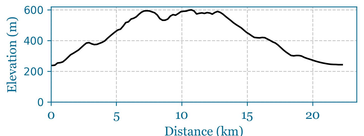 21.7km, 503m of climbing, some stunning views. No wonder there are so many Celtic burial mounds around here.