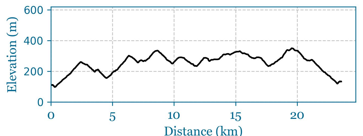 23.5km, 710m climbing. Dynamic Route Map Route Video GPX